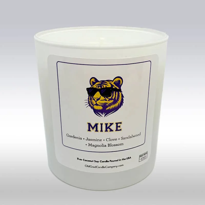 Our coconut soy candle, Mike, is named after the beloved LSU mascot and offers a captivating blend of gardenia, jasmine, clove, sandalwood, and magnolia blossom.